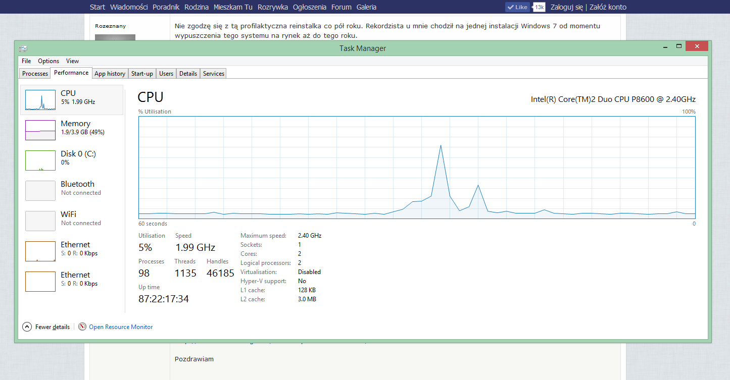 Polecam uptime i zajętość procesora, W tle FFox, Thunderbird, N360, GDrive, Skype.